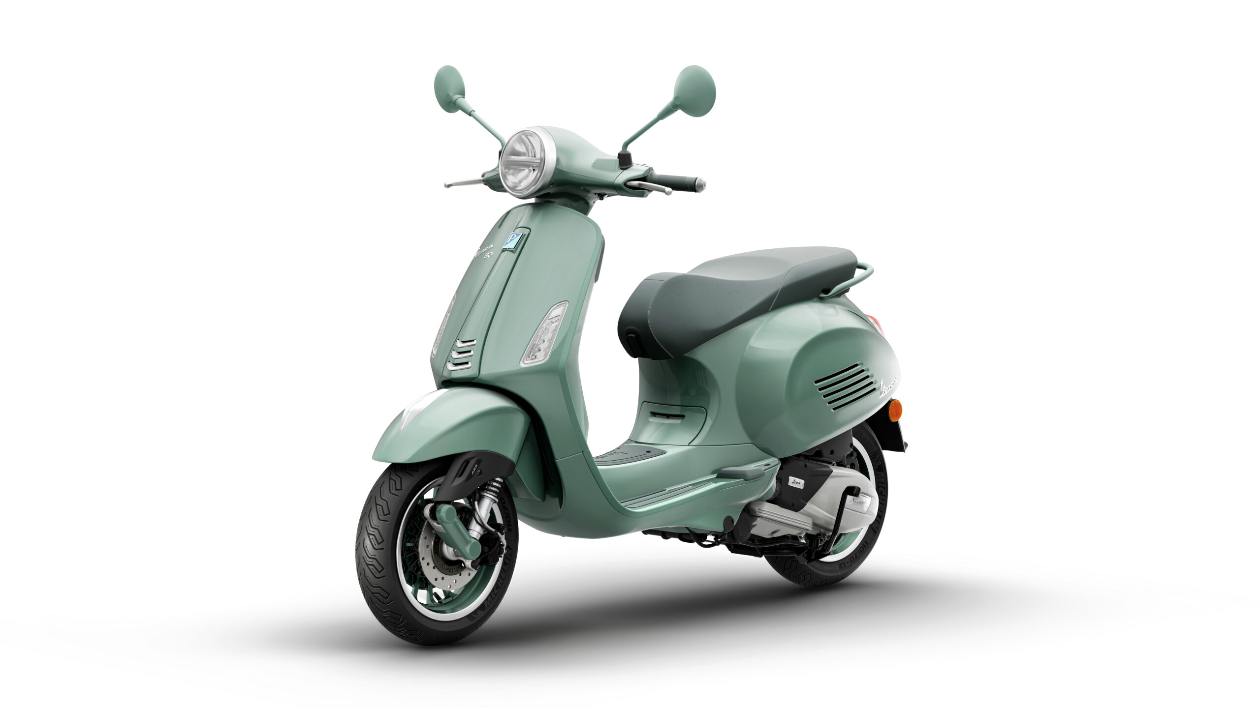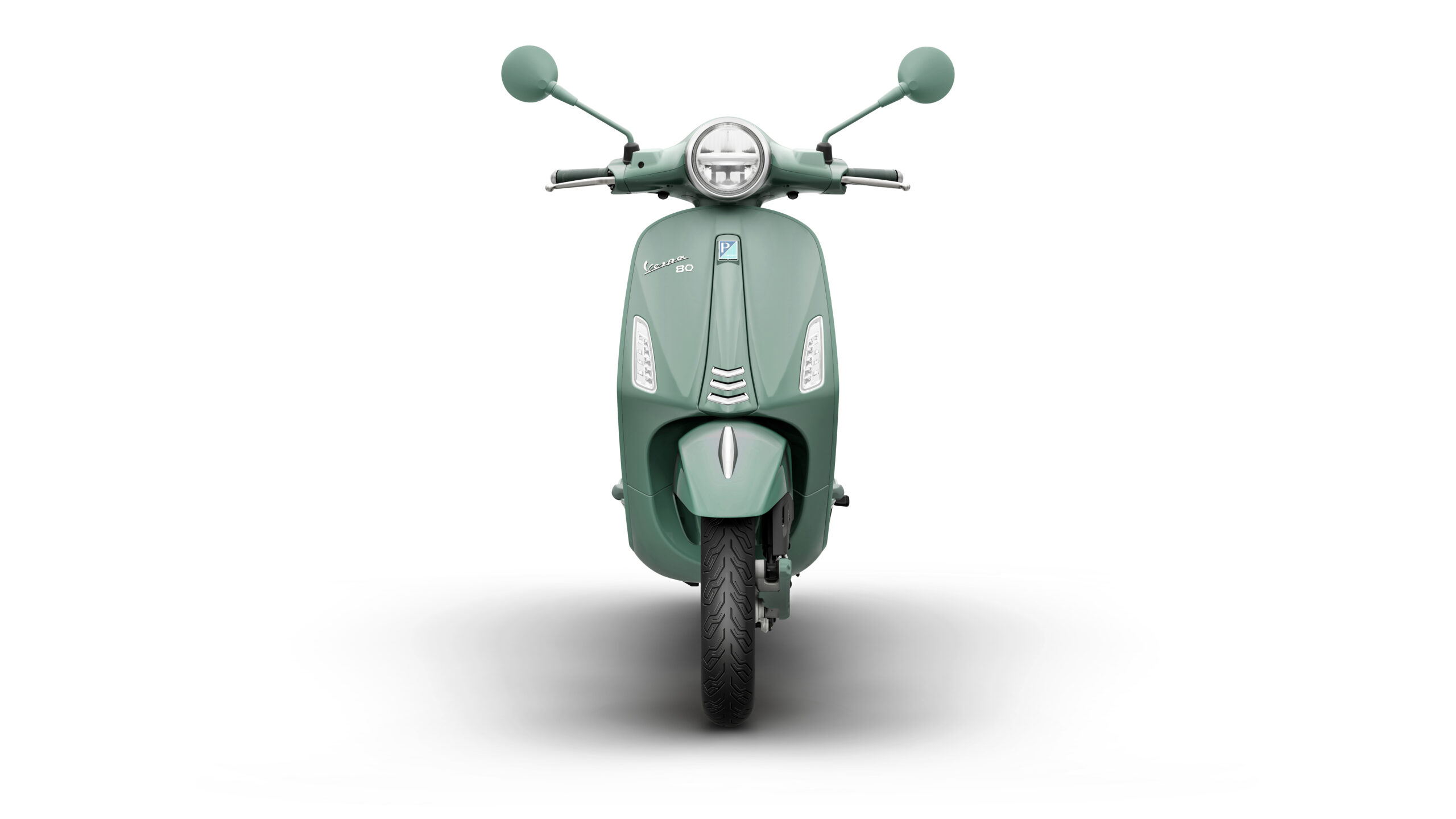 The Primavera 80th features a dedicated pastel shade, Verde 80th, inspired by the earliest single‑colour Vespas. Satin chrome accents pair with glossy and matte finishes, creating a harmonious and refined aesthetic. Solid wheel rims reinterpret the look of classic Vespa models with a modern sensibility.